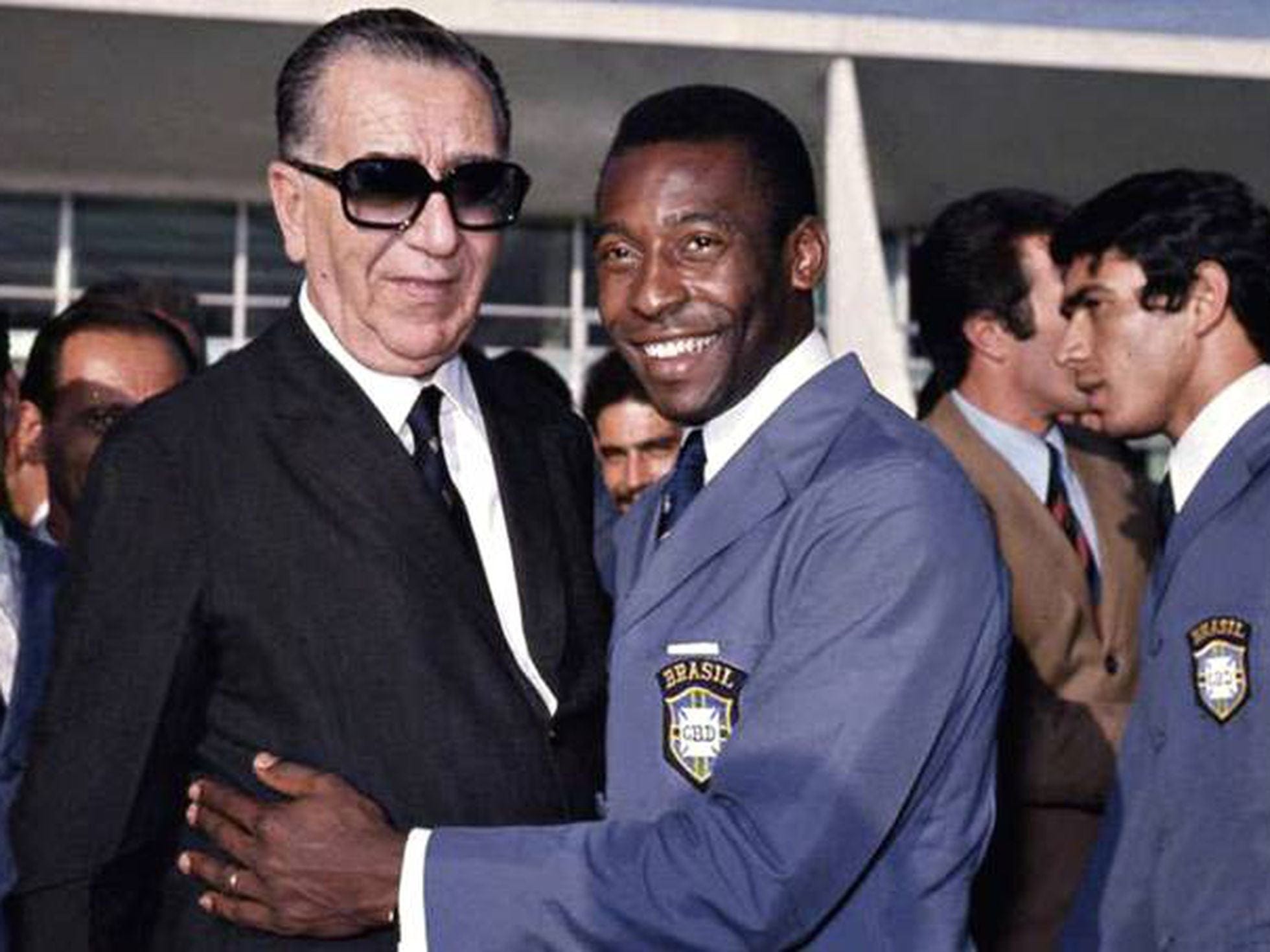 La mayor parte de la carrera de Edson Arantes do Nascimento, Pelé, transcurrió bajo los sucesivos gobiernos de la dictadura militar. A pesar de ello, el atacante del Santos evitó posicionarse políticamente. Su ex compañero en la Seleção Paulo Cezar Caju ha afirmado que Pelé tenía "el comportamiento del negro-sí-señor", según él característico del "negro sumiso, que acepta todo, que no disputa, que no critica, que no juzga". Como la dictadura militar utilizó la imagen de la selección brasileña como propaganda del régimen, Pelé fue acusado de haber servido como "propagandista" de la dictadura. Pelé negó la etiqueta; según él, su posición como jugador le impedía hacer concesiones. Siempre afirmó que "saludar a un presidente era un gesto personal. No significaba apoyar la dictadura".