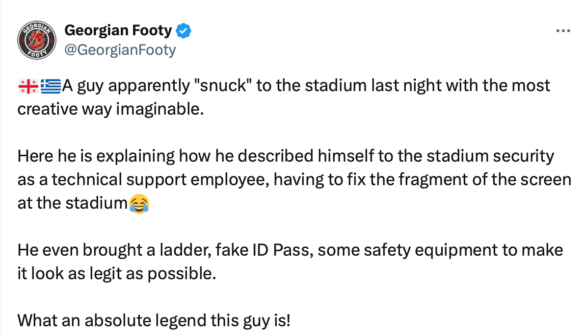 Este tipo es el crack que se consiguió un panel de LED’s, una acreditación chunga, un chubasquero como de empresa técnica, un frontal y una escalera. Con esos ingredientes fue capaz de colarse en el Estadio Nacional Boris Paichadze de Tiflis para presenciar el encuentro más trascendental de la historia del fútbol georgiano.