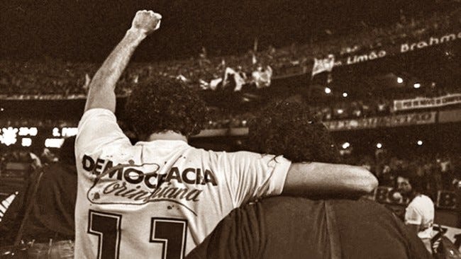 El propio Sócrates utilizaron su popularidad y presencia en la selección brasileña para expresar mensajes políticos y de oposición a la dictadura, como cuando lució una cinta en la cabeza con el lema "Pau" (Basta) durante el Mundial de 1986.
