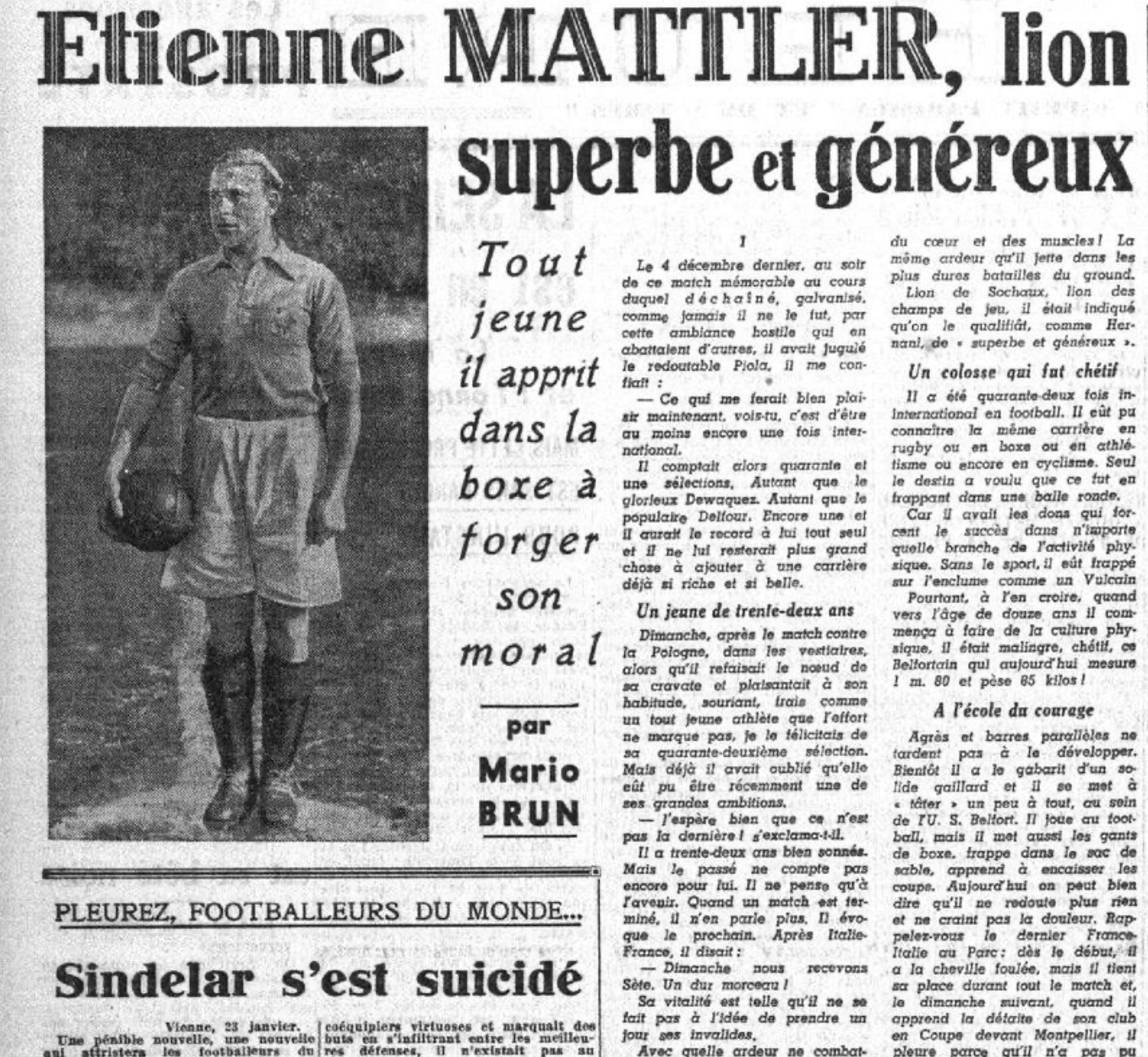 Y precisamente allí nacería Étienne Mattler, uno de los grandes símbolos del fútbol francés de entreguerras. No solo por su carrera deportiva sino también -y quizá especialmente- por su dimensión cívica y patriótica. Tras ver la luz en la ciudad de Belfort en 1905, dejó el ciclismo tras un accidente familiar y encontró en el fútbol su destino. Pasó por el club local y por el vecino Racing de Estrasburgo, pero alcanzaría la fama en el Sochaux. En ese club vinculado a la Peugeot -en cuya fábrica trabajaba- Mattler conquistó dos ligas (1935 y 1938) y una Copa de Francia. Defensor férreo, apodado ‘el León de Belfort’ o ‘el barrendero’, llegó a capitanear a la selección francesa, con la que disputó 46 partidos internacionales y participó en los tres primeros Mundiales. Antes de que la Segunda Guerra Mundial lo detuviera todo él era, definitivamente, uno de los jugadores más populares del país.