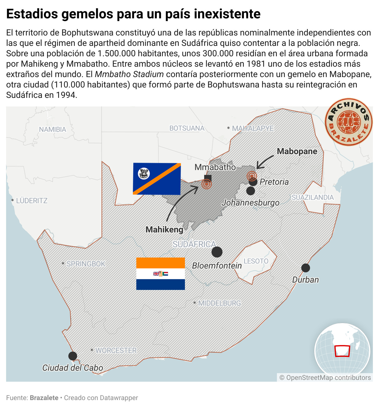 En Mafikeng, al noroeste de Sudáfrica, se levanta todavía un anillo de hormigón con 59.000 asientos que fue bautizado en 1981 como Mmabatho Stadium y presentado al mundo como orgullo de una república joven y autosuficiente. El problema es que aquella república no existía más que en los papeles del apartheid. Se llamaba Bofutatsuana y fue una ficción constitucional. Un territorio declarado “soberano” en 1977 con un único fin: desentender al Estado blanco de millones de sudafricanos negros. Otros tres bantustanes -reservas para población no blanca- adquirieron por aquella época la misma independencia impostada: Transkei, Venda y Ciskei.