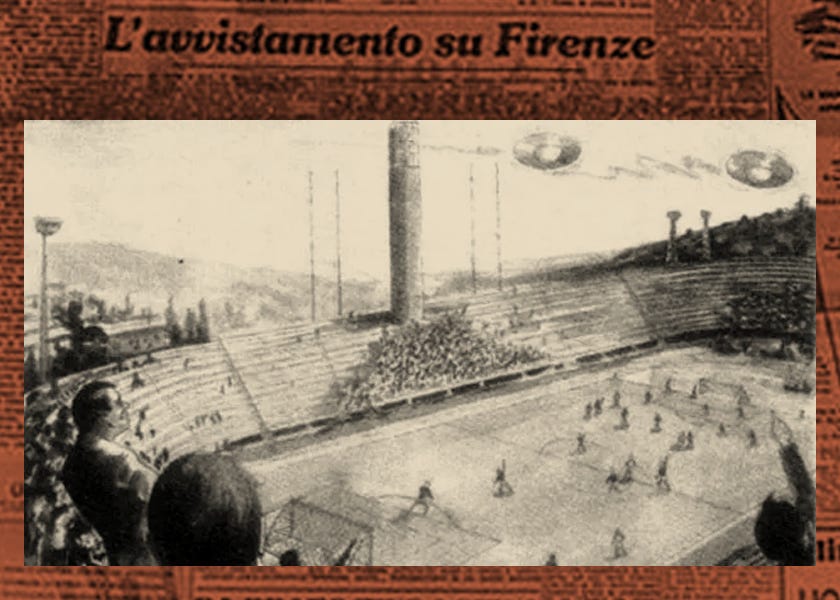 A las 15:27 de aquel día el partido amistoso entre dos clubes toscanos, Fiorentina y Pistoeise, tuvo que ser detenido. Los jugadores se quedaron quietos, el árbitro paralizado, y el balón rodó hasta detenerse en algún punto del césped. Sobre el estadio flotaban varios objetos brillantes —“como huevos plateados”, diría después Ardico Magnini, defensa y leyenda del club viola—. Otros los vieron “como cigarros habanos que se movían rápido y luego se detenían”. Durante unos minutos, el Calcio pareció una película de ciencia ficción.