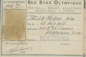 El paso del joven trabajador Rino Della Negra entre los FTP-MOI [Francotiradores partisanos y mano de obra emigrada, tremendo naming para un comando] no es el más conocido de todos los resistentes. Sobre su experiencia en los campos de fútbol durante mucho tiempo solo quedó un resplandor incierto: poco más que un rostro pintado en las pancartas de los Ultras del Red Star. Un especialista en la historia local de Saint-Ouen, Claude Dewaele - ex trabajador metalúrgico - exhumó su fugaz paso en el Red Star Olympique, antiguo nombre del Red Star FC. Una licencia para la temporada 1943/44 y una foto del equipo lo demuestran: Rino Della Negra, miembro del 3er destacamento del grupo parisino de FTP-MOI, y autor de casi 200 atentados contra las fuerzas alemanas y de colaboración en París, sí llegó a lucir la camiseta verde.