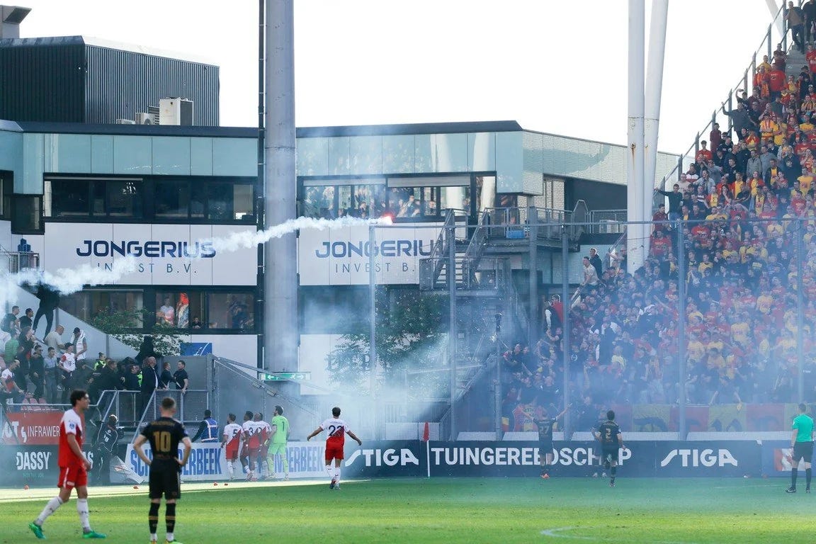 El Utrecht gobernaba el marcador 1-0 y estaba a pocos minutos de lograr el boleto europeo cuando las cosas se fueron de control: los radicales del Utrecht lanzaron fuegos artificiales hacia la grada visitante.