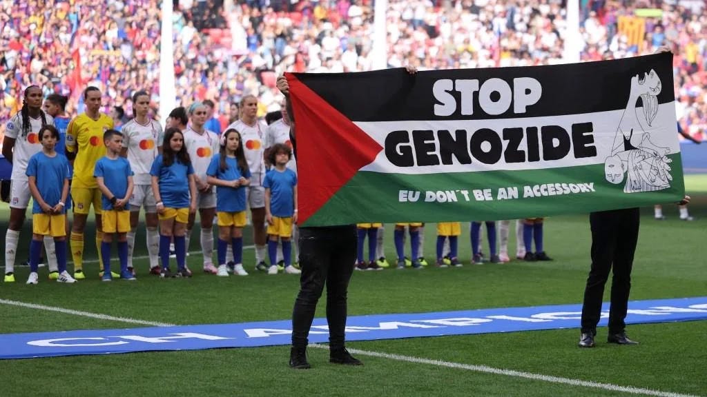 Antes de la final de la Champions femenina, dos figuras saltaron al césped de San Mamés para mostrar una pancarta contra las represalias indiscriminadas contra la población palestina.